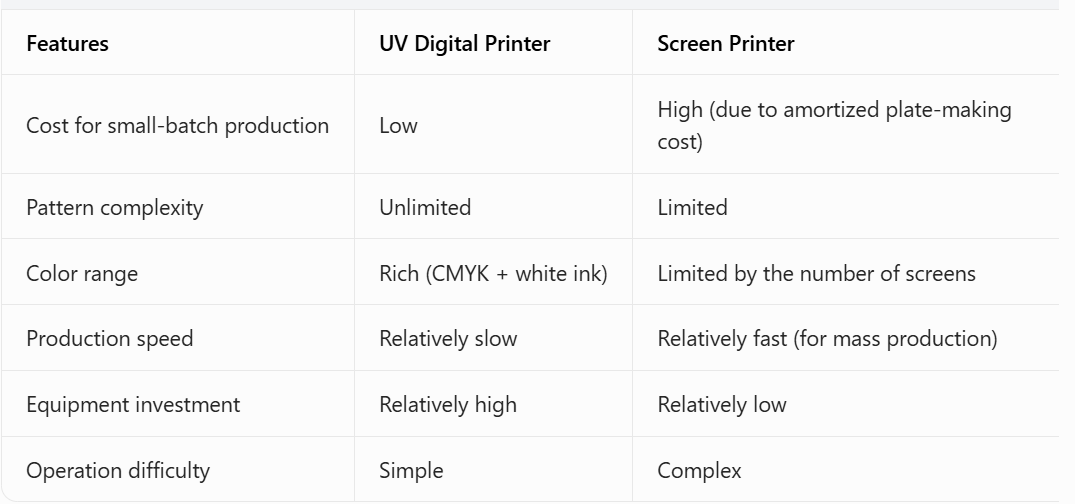 In summary, if you prioritize personalization, small-batch production and high quality, a UV digital printer is a better choice. For large-scale standardized production, screen printing may be more economical.